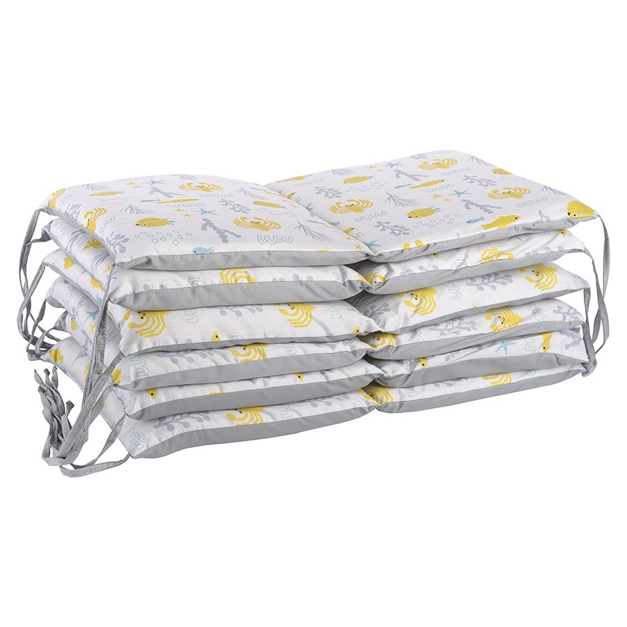 Бортик в кроватку из сатина с принтом Oceania world из коллекции Tiny world сделает первую кроватку малыша особенно уютной и безопасной: защитит от случайного сквозняка, немного приглушит внешние звуки и свет, прикроет жесткое ограждение кроватки. Принт нанесен на обе стороны бортика. Изделие подойдет для обычной и для круглой кроватки-трансформера, состоит из 6 секций по 2 «подушечки» и крепится к кроватке прочными завязками. Бортики будут сочетаться с любым постельным бельем.