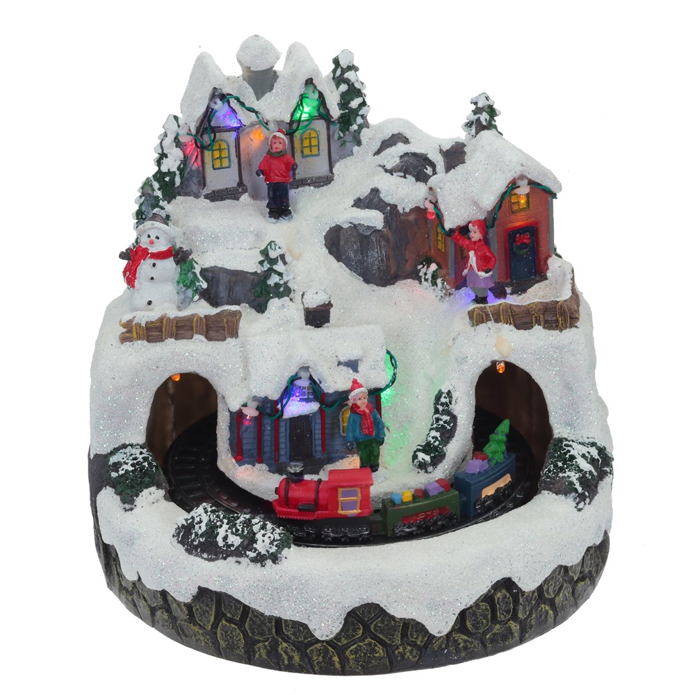 Веселые огоньки, забавный домик, елки, восторженная детвора, железная дорога с волшебным паравозом и снеговик. Хотите, чтобы наступающий год был ярким, полным веселых чудес? Тогда эта оригинальная миниатюра для вас. Фигурка с подсветкой и функцией движения. Работает от трех батареек АА (не прилагаются).
