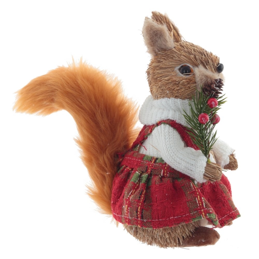 Декоративная новогодня фигурка из соломы. Белочка с рыжим пушистым хвостом, в ярком костюмчике, с еловой веточкой в лапке.