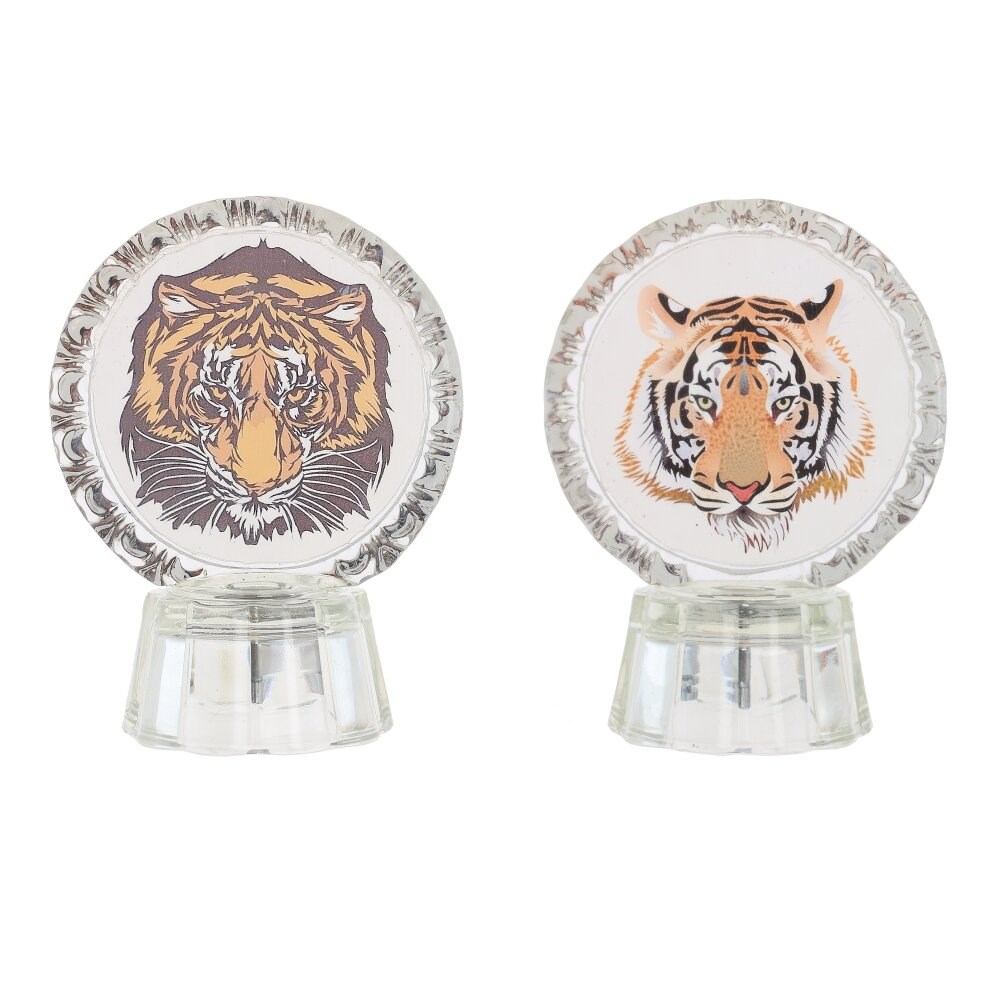 Стеклянное панно на пластиковой подставке, с выключателем. Оригинальное оформление изображения Тигра в светящемся ореоле. Работает от трех батареек LR41.