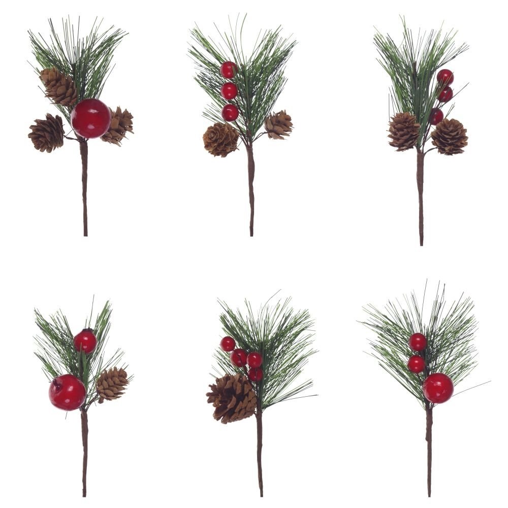 Декоративное украшение "Ветка" изготовлена из полимерных материалов. Украшена натуральными шишками, искусственными ягодами,фруктами. Может применяться, как украшение интерьера и для составления икебаны. Размер: L7 W5 H15 см, представлено в 4-х вариантах. Упаковка - пленка
