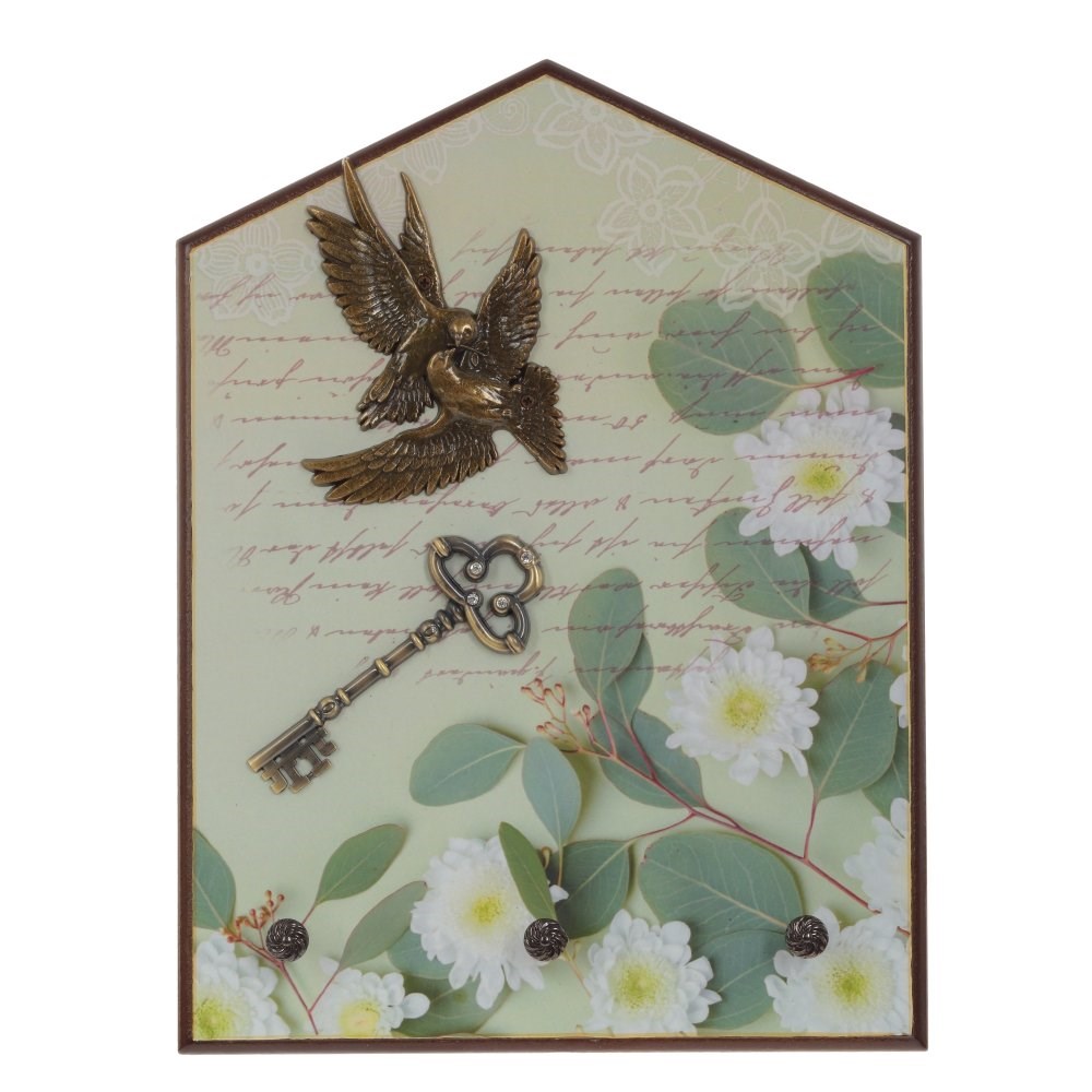 Ключница в форме домика открытого типа с тремя крючками. Украшена изображением цветов и металлическим декором в виде ключа и птицы . Ключница – предмет не только красивый, но и функциональный, поэтому ей найдется место и в квартире, и в загородном доме.