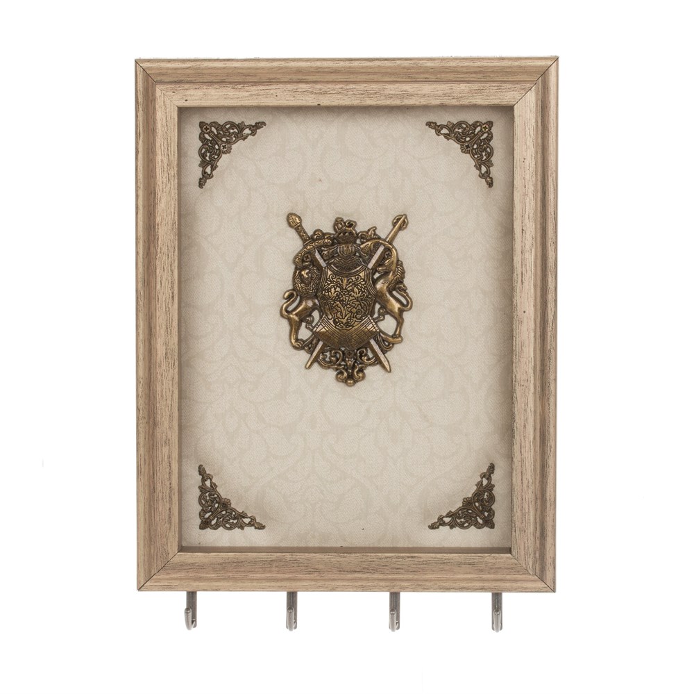Ключница открытого типа с четырьмя крючками, изготовлена из пластика. Цвет бежевый с металлическим декором в виде герба и ажурных угловых элементов. Крепится на стену с помощью двух металлических петелек.