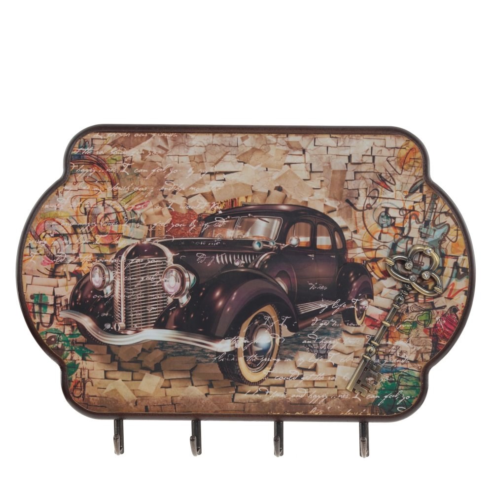 Ключница открытого типа с четырьмя крючками. Украшена изображением ретро автомобиля и декоративным металлическим элементом в виде ключа. Ключница – предмет не только красивый, но и функциональный, поэтому ей найдется место и в квартире, и в загородном доме.