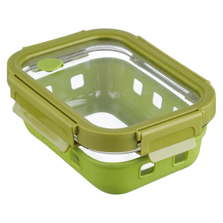 Контейнер стеклянный в чехле из силикона отлично подходит для хранения, запекания и транспортировки продуктов, в том числе готовых блюд. Емкость из боросиликатного стекла не впитывает запахи и загрязнения, легко моется. Крышка с надежными пластиковыми замками на каждой стороне обеспечивает плотное закрывание. Материалы не содержат бисфенол-А и являются абсолютно безопасными для здоровья. Наличие специального вентиляционного отверстия позволяет выпустить лишний воздух или горячий пар, что повышает герметичность и улучшает условия хранения продуктов. Силиконовый чехол без труда снимается для более тщательной очистки контейнера.