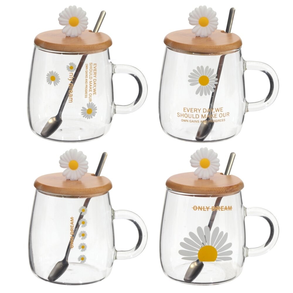 Стеклянная кружка объемом 450 мл идет в наборе с ложечкой и деревянной крышкой. Отличается привлекательным дизайном и прекрасно подойдет для повседневного домашнего использования. Представлена в 4 вариантах.
