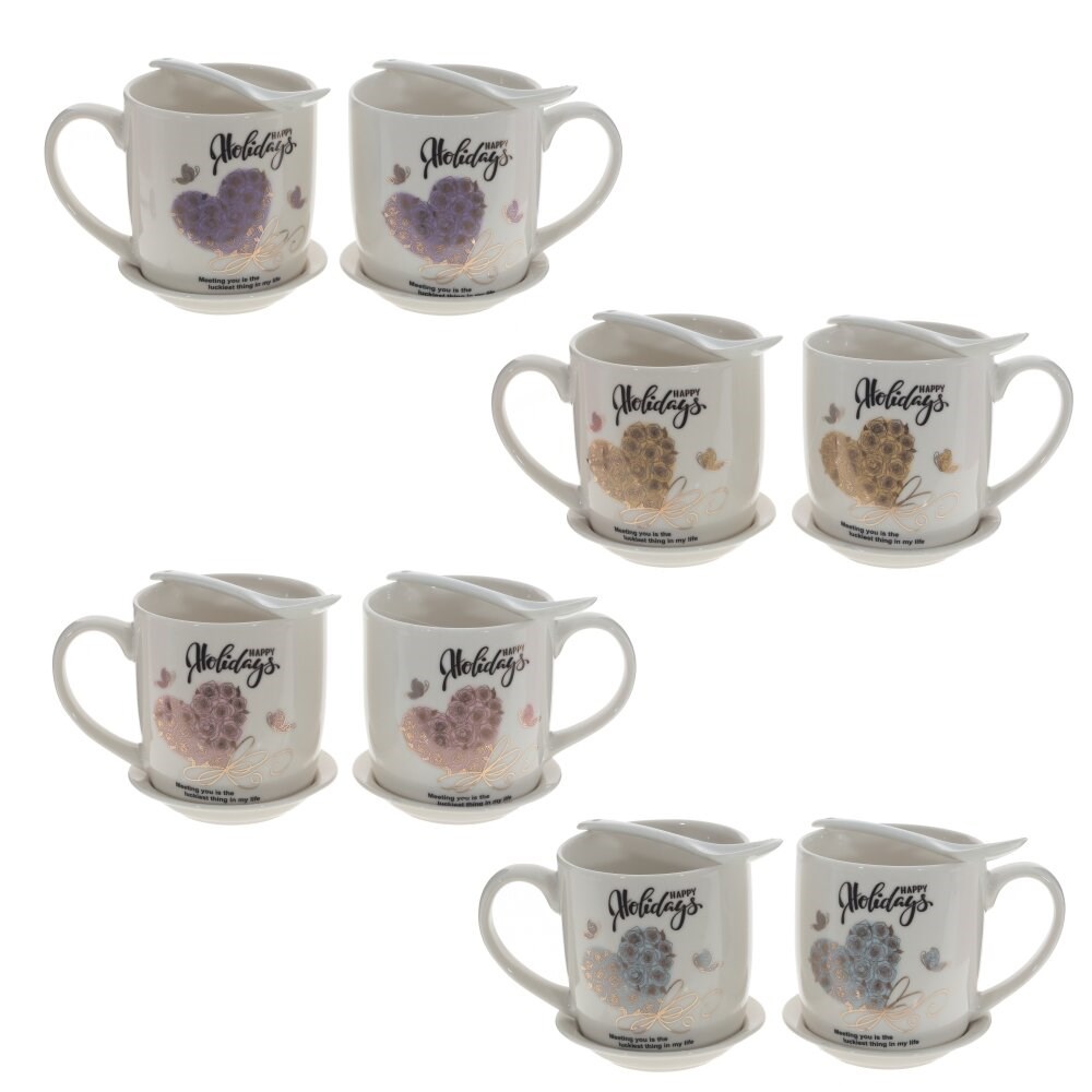 Набор из 2-х фарфоровых кружек с удобной ручкой. Отличается привлекательным дизайном с изображением сердца. Кружка (12*8*9, 350 мл) идет в наборе с фарфоровой ложечкой и блюдцем (9,5*9,5*1,5). Представлена в четырех вариантах