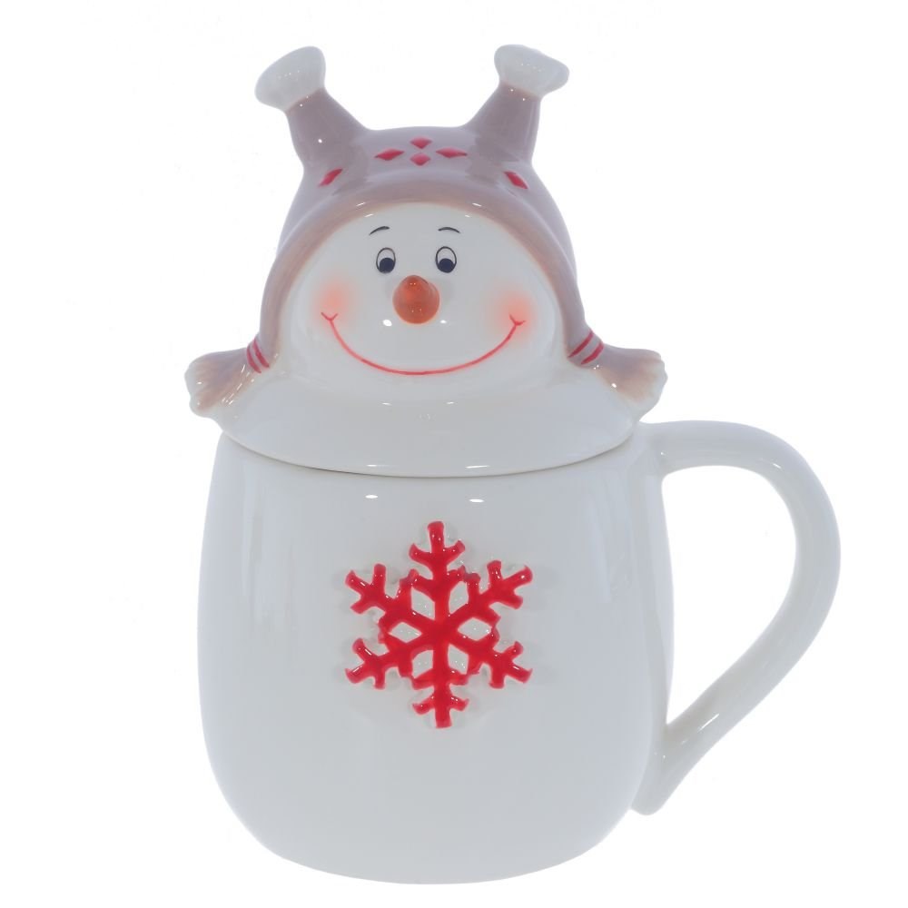 Кружка с крышкой из серии посуды "Снеговик". Крышка в форме очаровательного улыбающегося снеговичка, на самой кружке - красная снежинка.