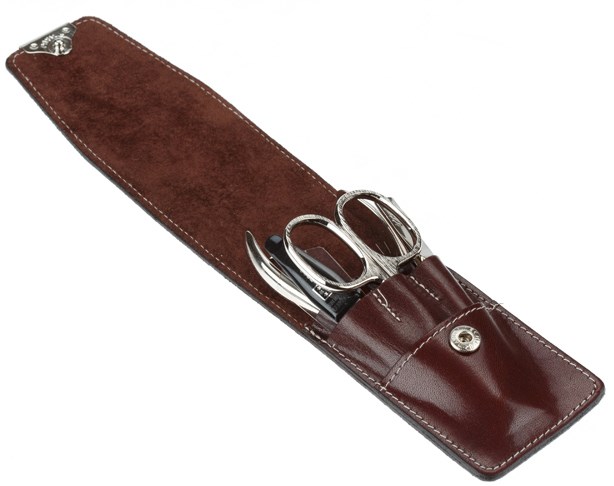 Элегантный чехол на кнопке выполнен из натуральной итальянской воловьей кожи, инструменты изготовлены из углеродистой стали превосходного качества.