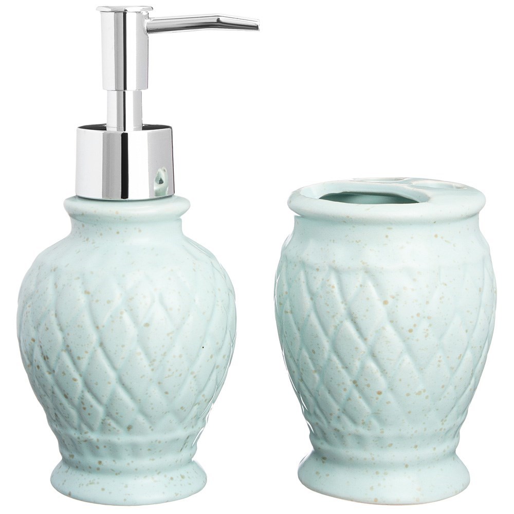 Набор для ванной комнаты 2 предмета: диспенсер для жидкого мыла+ стакан для зубной пасты и зубных щеток. Диспенсер прост и удобен в эксплуатации, мыло подаётся порционно, легким нажатием руки.
