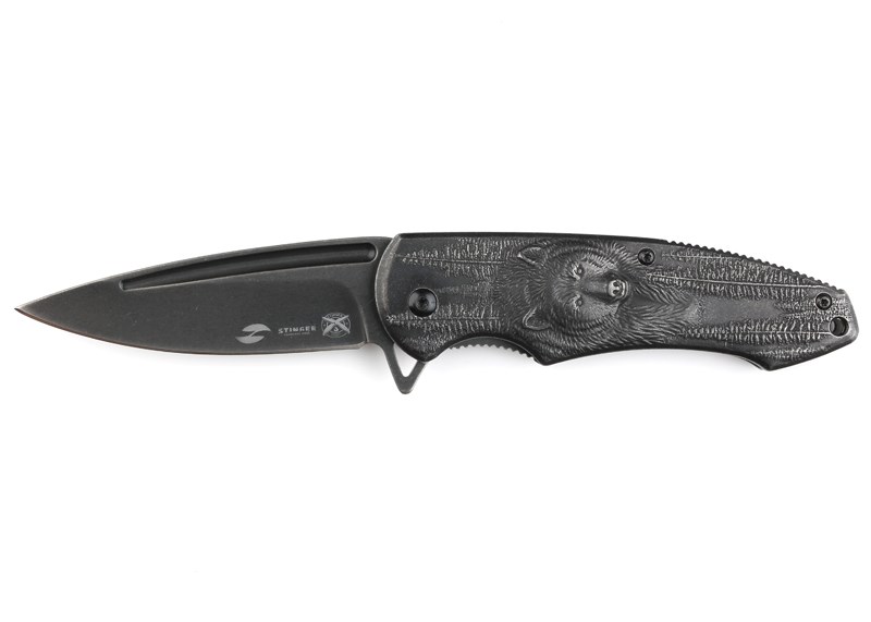 Нож складной Stinger, 82 мм (чёрный), рукоять: сталь (чёрный с медведем), картонная коробка