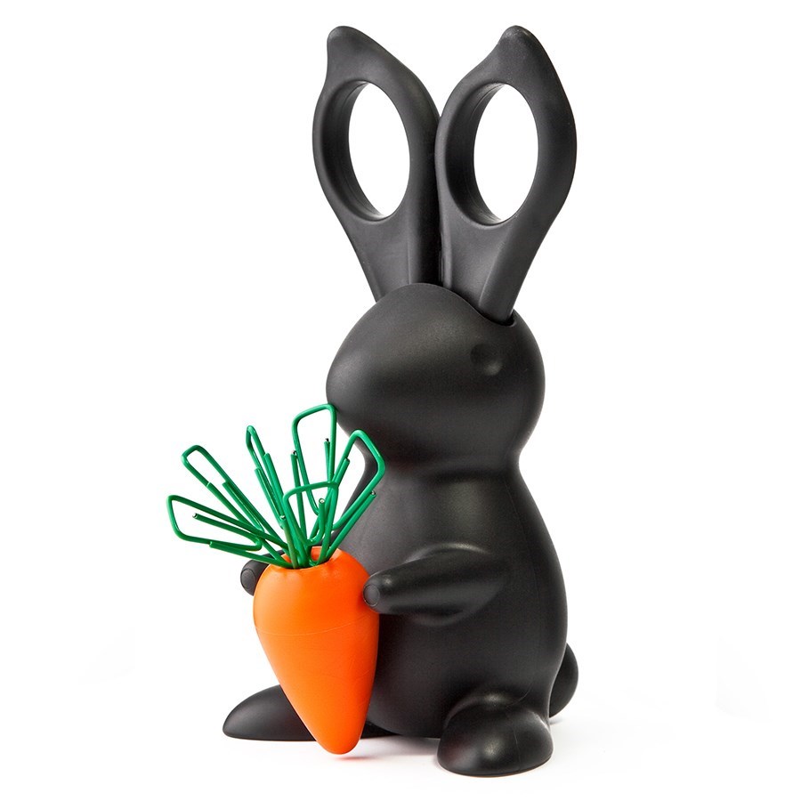 Зайчик 2 в 1! Это и острые ножницы - ушки и хорошенький диспенсер для скрепок в виде магнитной морковки. После того как закончатся, входящие в комплект скрепки, Вы можете использовать любые другие, желательно зеленого цвета:)