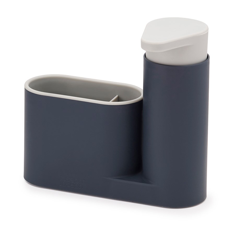 Набор состоит из удобного дозатора для жидкого мыла и подставки с двумя отделениями для щеток и губок. Благодаря компактному дизайну органайзер может быть размещен даже на узкой стороне раковины.