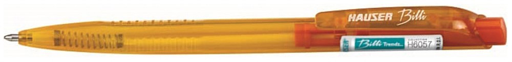 Шариковая ручка Hauser Billi Trendz, корпус - полупрозрачный пластик под цвет чернил, элементы дизайна - пластик под цвет чернил, цвет чернил - оранжевый, толщина стержня - 1,0мм, 12шт/уп