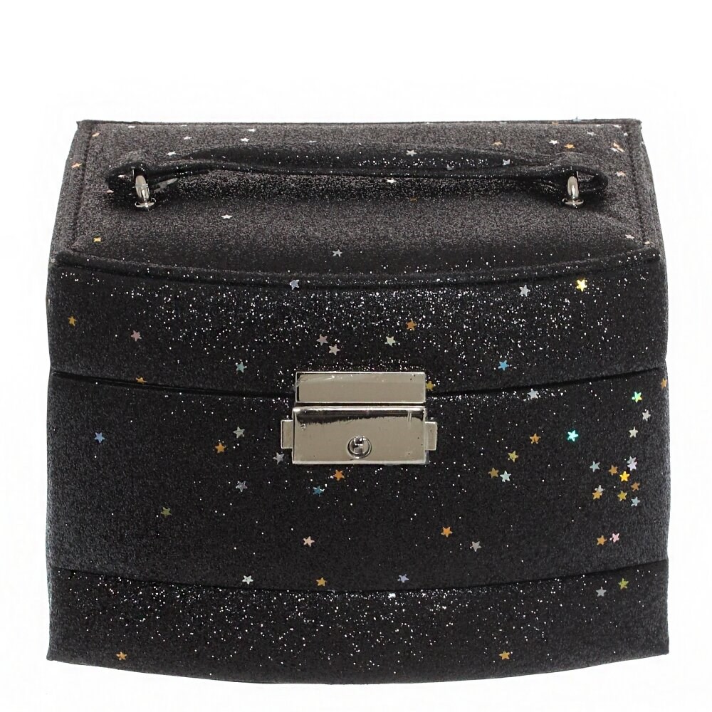 Шкатулка из качественной искусственной кожи с автоматическим механизмом. На внутренней стороне крышки зеркало. Верхний уровень разделен на три секции, одна из которых с валиками для колец. Средний уровень - две секции. Нижний уровень - выдвижной, для крупных украшений или бумаг. Замок надежный и автоматический, изготовлен из нержавеющей стали, мягкая ручка для удобства транспортировки.