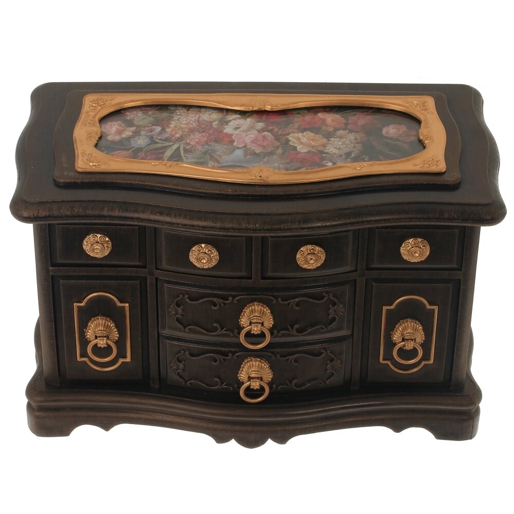 Шкатулка для украшений музыкальная, в форме "Комода" выполнена под старину. Крышка декорирована цветочным рисунком, внутри с зеркалом. Имеет четыре выдвижных ящичка. Материал - полимерные материалы. Работает от заводного ключа.