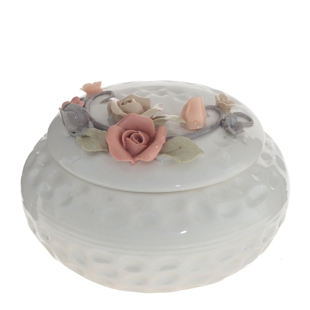 Фарфоровая шкатулка круглой формы с цветочным объемным декором на крышке. Подарить изделие можно прекрасной девушке, женщине, маме, бабушке, подруге или сестренке.В изящной фарфоровой шкатулке принято хранить самые ценные украшения или дорогие сердцу мелочи.