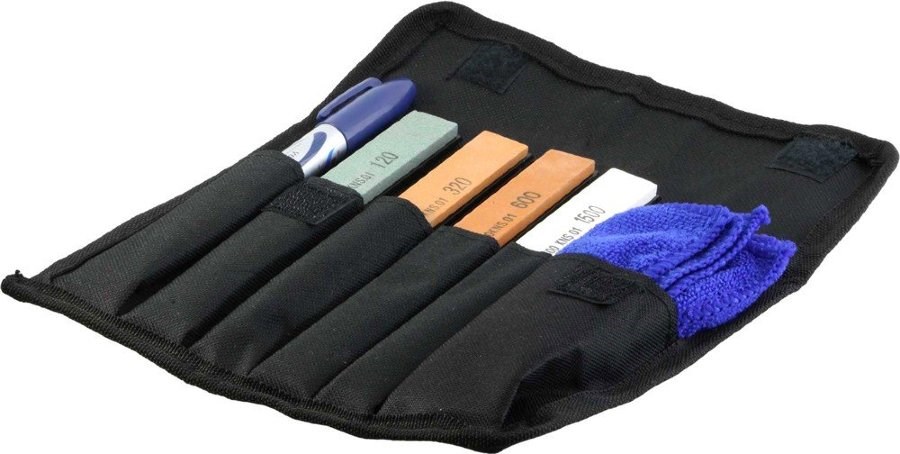 Всего с точилкой используется четыре бруска. Зернистость отображена числом на каждом из абразивных камней. Большее число означает мелкую зернистость, меньшее, что зернистость крупнее и брусок более грубый. Когда клинок слишком затуплен или требуется переточка на иной угол – используем сначала брусок наибольшей зернистости (120 или 320 единиц). Потом черед средней грубости – бруска с обозначением "600". Завершаем заточку наиболее деликатным – с надписью "1500". Простой правке и постоянной поддержке остроты достаточно брусков с показателями 600 и 1500.