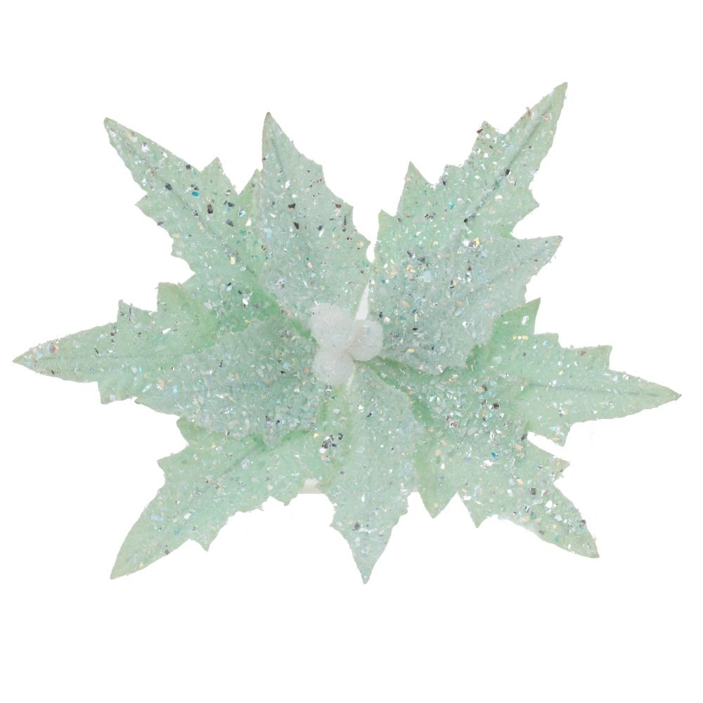 Нежная рождественская пуансетия. Лепестки выглядят невероятно эффектно: на их кончиках мерцает россыпь блесток, сердцевина состоит из бусинок. Прикрепите этот стильный новогодний цветок на елку и она заиграет яркими красками.