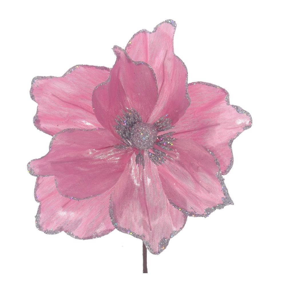 С ролью украшения новогодней ели прекрасно справится этот искусственный цветок. Магнолия розового цвета. Благородность цвета подчеркивают серебряные блестки по краям и в середине.
