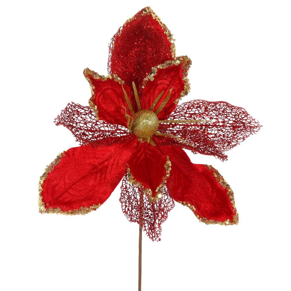 С ролью украшения новогодней ели прекрасно справится этот искусственный цветок. Могнолия красного цвета. Благородность цветка подчеркивают золотые блестки по краям и ажурные лепестки.