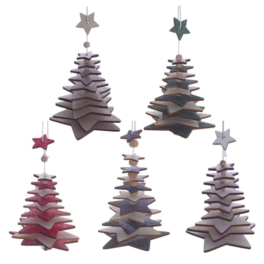 Новогоднее подвесное украшение выполнено из дерева в виде елочки из звезд, представлено в 5-ти вариантах, упаковано в пакет