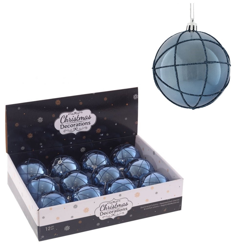 Набор из 12-ти шаров для елки в шоу-боксе. Эти синие с тонким рисунком новогодние шары из пластика, непременно порадуют вас своим изяществом и прекрасно дополнят праздничный наряд лесной красавицы.