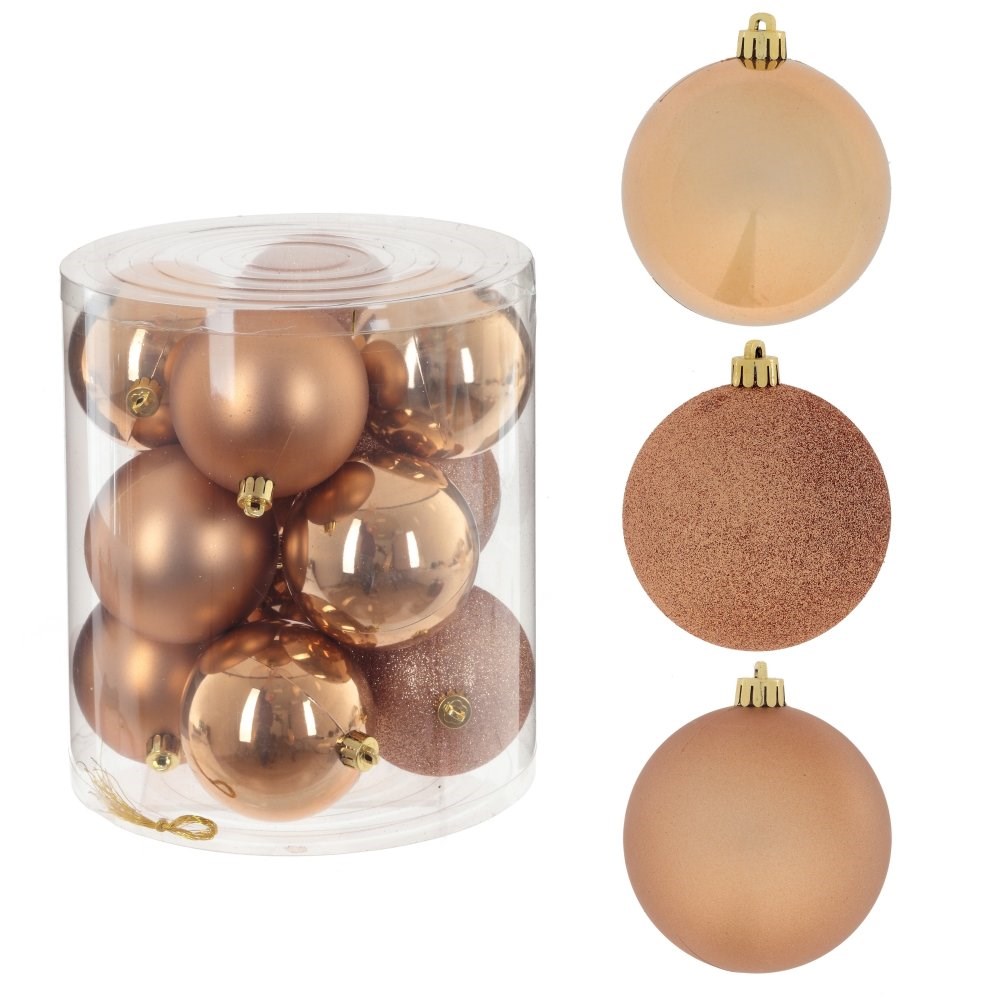 Набор из 12-ти елочных шаров выполнен в единой цветовой гамме. В составе набора - пластиковые шары разной фактуры - глянцевые, матовые, с глиттером. Прекрасно смотрятся в убранстве новогодней ели. Поставлются в прозрачном пластиковом контейнере.