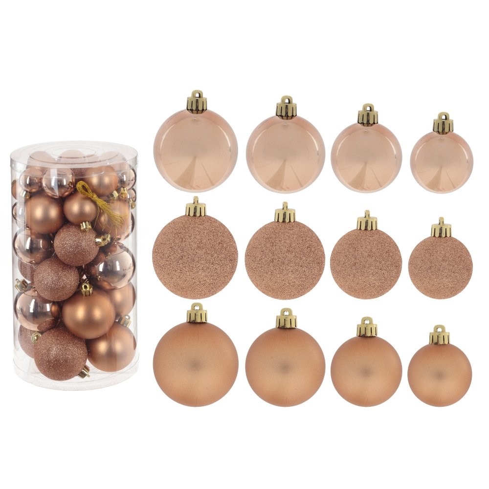 Набор из 24-ти елочных шаров выполнен в единой цветовой гамме. В составе набора - пластиковые шары разной фактуры - глянцевые, матовые и с глиттером. Прекрасно смотрятся в убранстве новогодней ели. Поставлются в прозрачной пластиковой упаковке.