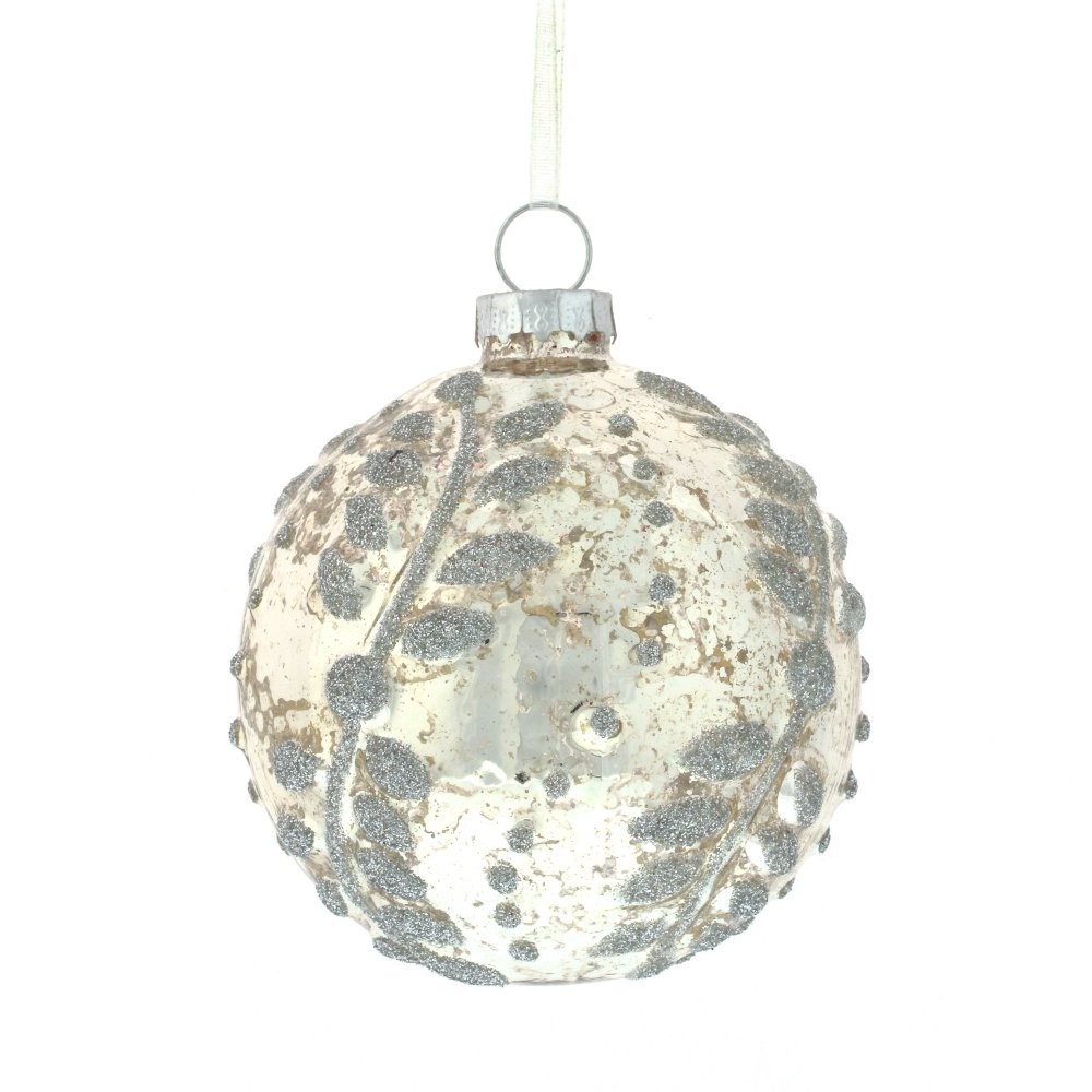 Новогодний необычный серебристый елочный шар с растительным узором, изготовлен из стекла, упаковка- коробка