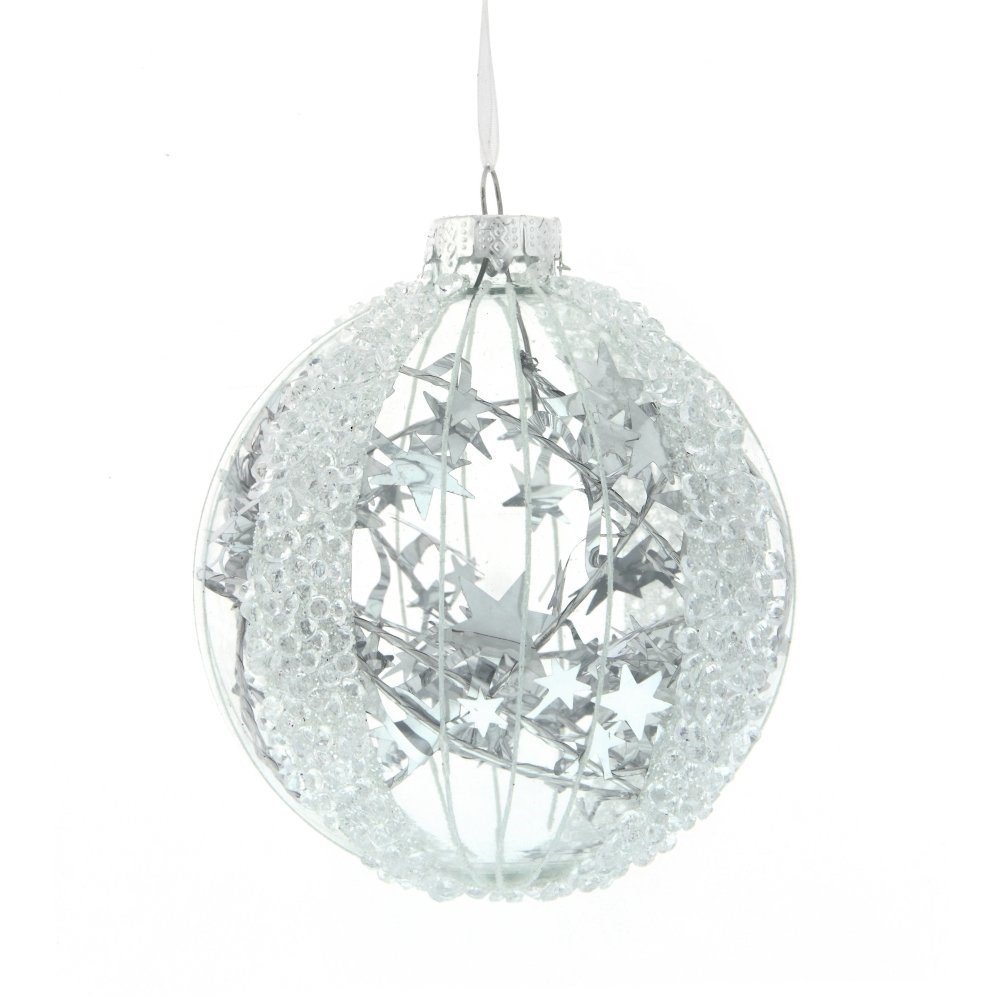 Новогодний прозрачный елочный шар украшен бисером снаружи и тонкой гирляндой из серебряных звездочек внутри. Будет чудесно смотреться на хвойных веточках ели.
