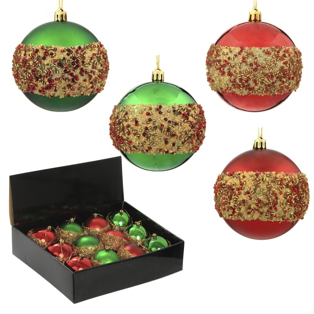 Набор из 12-ти новогодних украшений (красивые елочные шары, украшенные поперечными полосами из страз) изготовлен из полимерных материалов, в подарочной упаковке