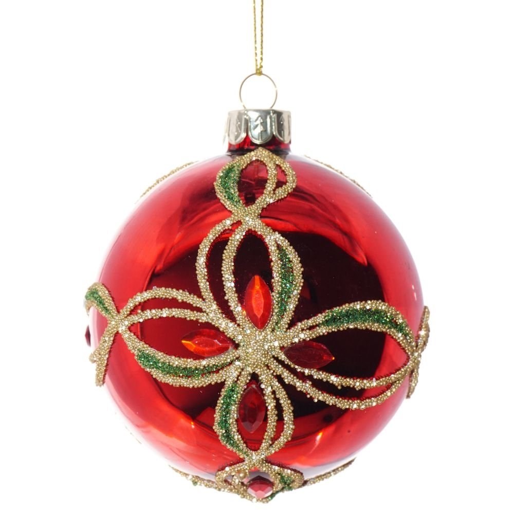 Новогодний красный елочный шар с золотым блестящим узором, изготовлен из стекла