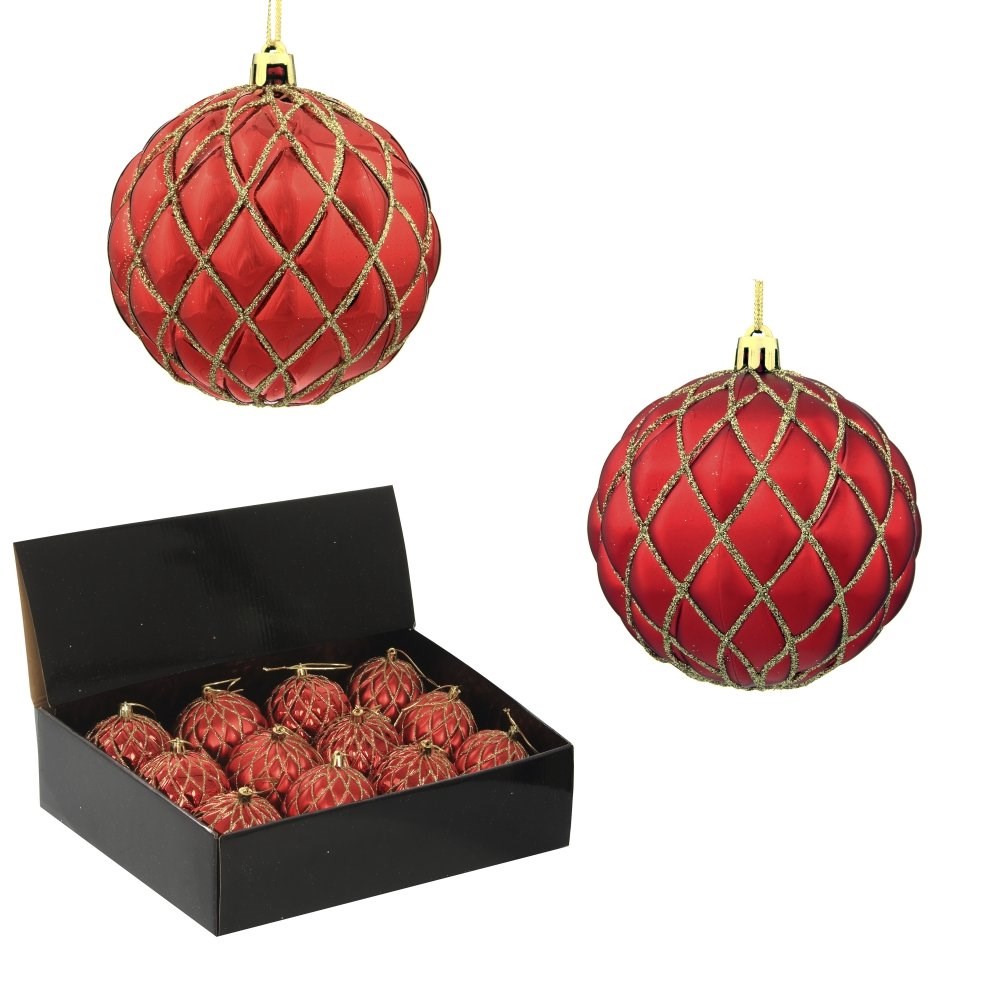 Набор из 12-ти новогодних украшений (красивые красные елочные шары) изготовлен из полимерных материалов, в подарочной упаковке