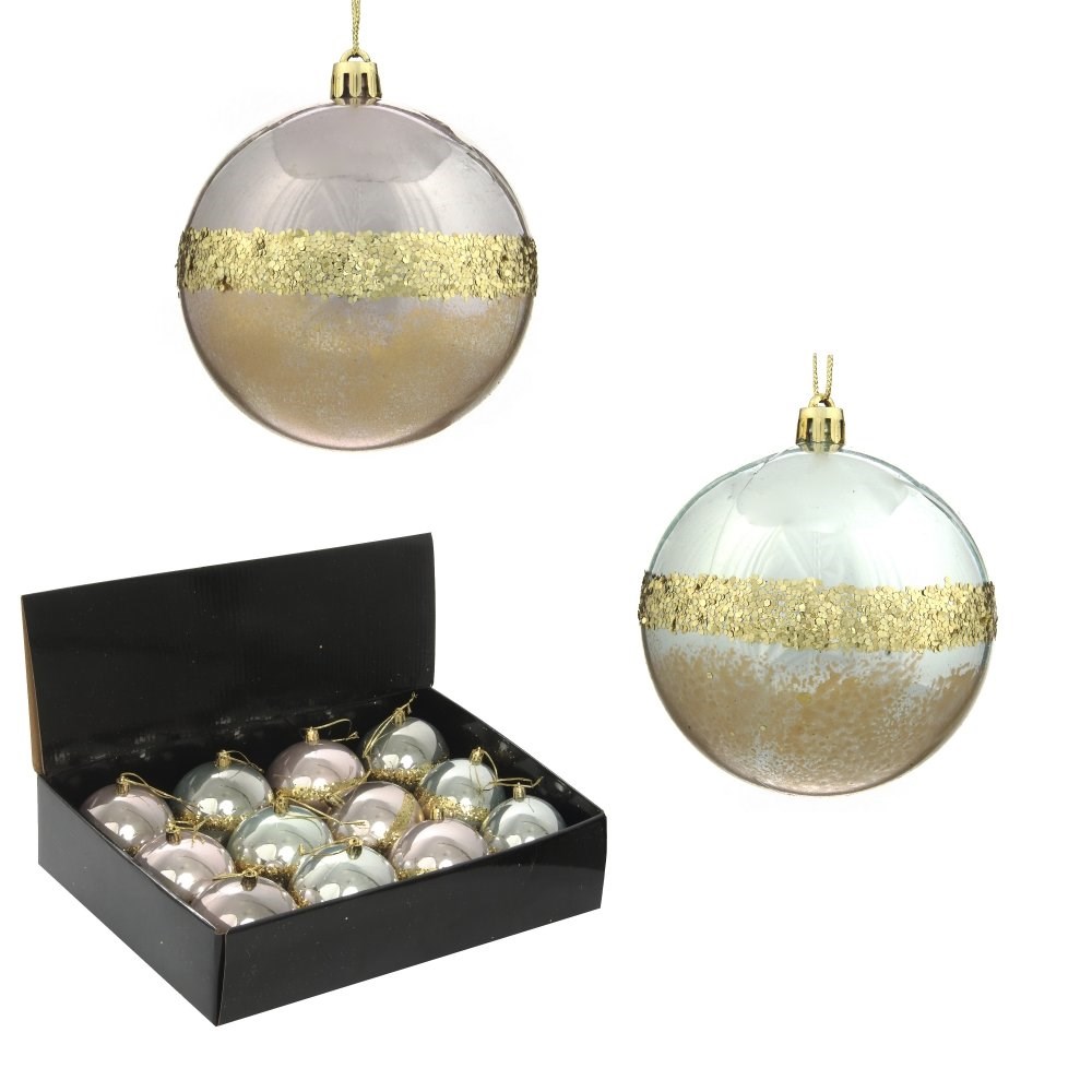 Набор из 12-ти новогодних украшений (красивые двухцвтные елочные шары с золотой полосой) изготовлен из полимерных материалов, в подарочной упаковке