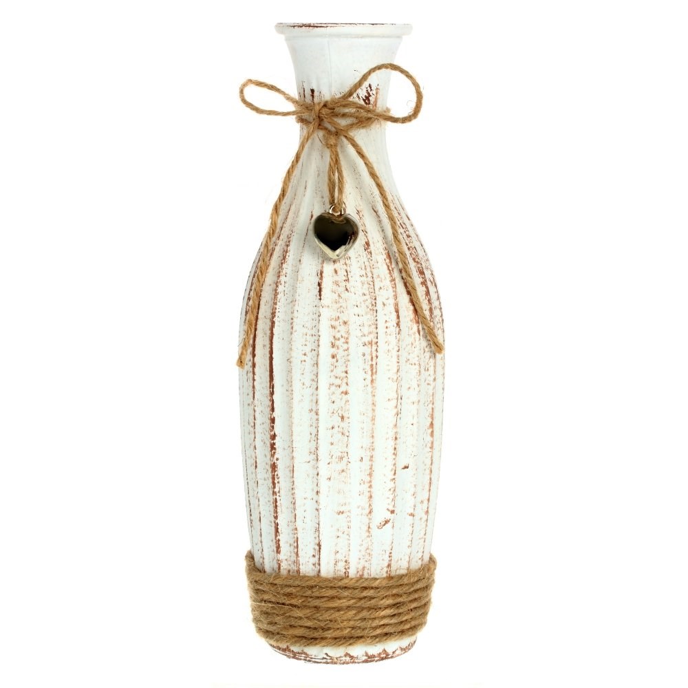 Стеклянная ваза в форме бутылки с эффектом потертости, декоративным шнурком и подвеской в виде сердечка, настолько красива и необычна, что сможет самостоятельно украсить интерьер и без цветов. Разместите эту модель у себя в доме - и она станет дивным элементом декора.