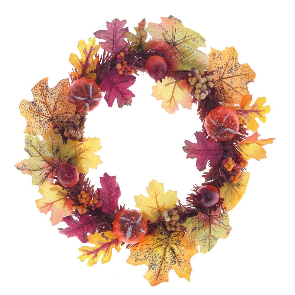 Колоритный, теплый, уютный осенний венок. Подарит массу приятных эмоций, придаст вашему интерьеру индивидуальность, станет отличным подарком друзьям и близким.В основе веточки, декорирован искусственными тыковками, ягодами и листьями ярких осенних цветов.