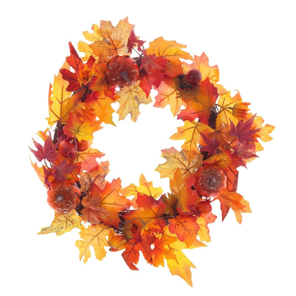 Колоритный, теплый, уютный осенний венок. Подарит массу приятных эмоций, придаст вашему интерьеру индивидуальность, станет отличным подарком друзьям и близким.В основе веточки, декорирован искусственными листьями и тыквами ярких осенних цветов.