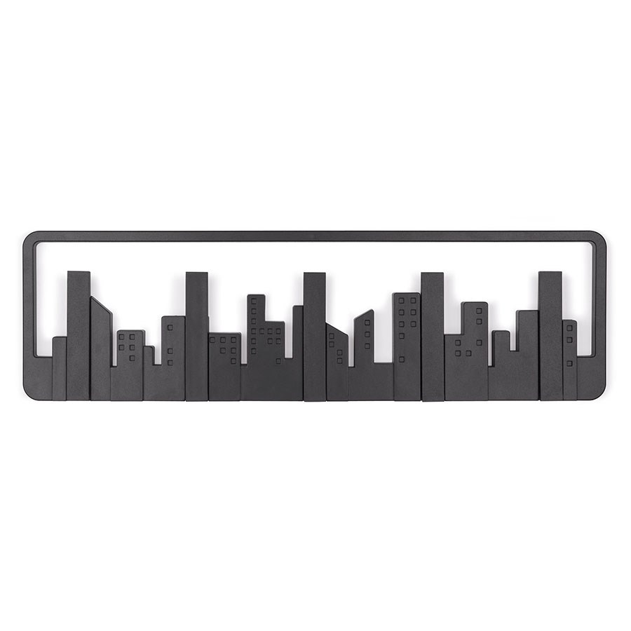 Настенная вешалка Skyline торговой марки Umbra сочетает в себе функциональность и простоту форм. Оригинальное исполнение изделия – это заслуга креативных дизайнеров Хелены Т. Миллер и Трейси Вонг. Вешалка представлена в виде городского пейзажа с многоэтажными домами. Для изготовления конструкции использовался экологически безопасный полистирол, который отличается высокой прочностью и износоустойчивостью. Вешалка имеет 5 откидных крючков, каждый из которых способен выдержать нагрузку до 2 кг.