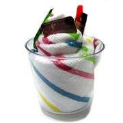 Полотенце-пирожное, купить недорого которое предлагает наш магазин, выполнено в оригинальной цветовой гамме с использованием натурального хлопка. Мягкая и нежная на ощупь махра создает максимум комфорта для кожи, одновременно превосходно впитывая влагу. Контрастные полоски желтого, зеленого, синего и красного цветов, нанесенные на основной белый фон, отлично сохраняют безупречную четкость линий, не окрашиваясь в процессе стирки. Упаковка полотенца-пирожного украшена декоративными магнитиками в виде кусочка шоколада и корицы.