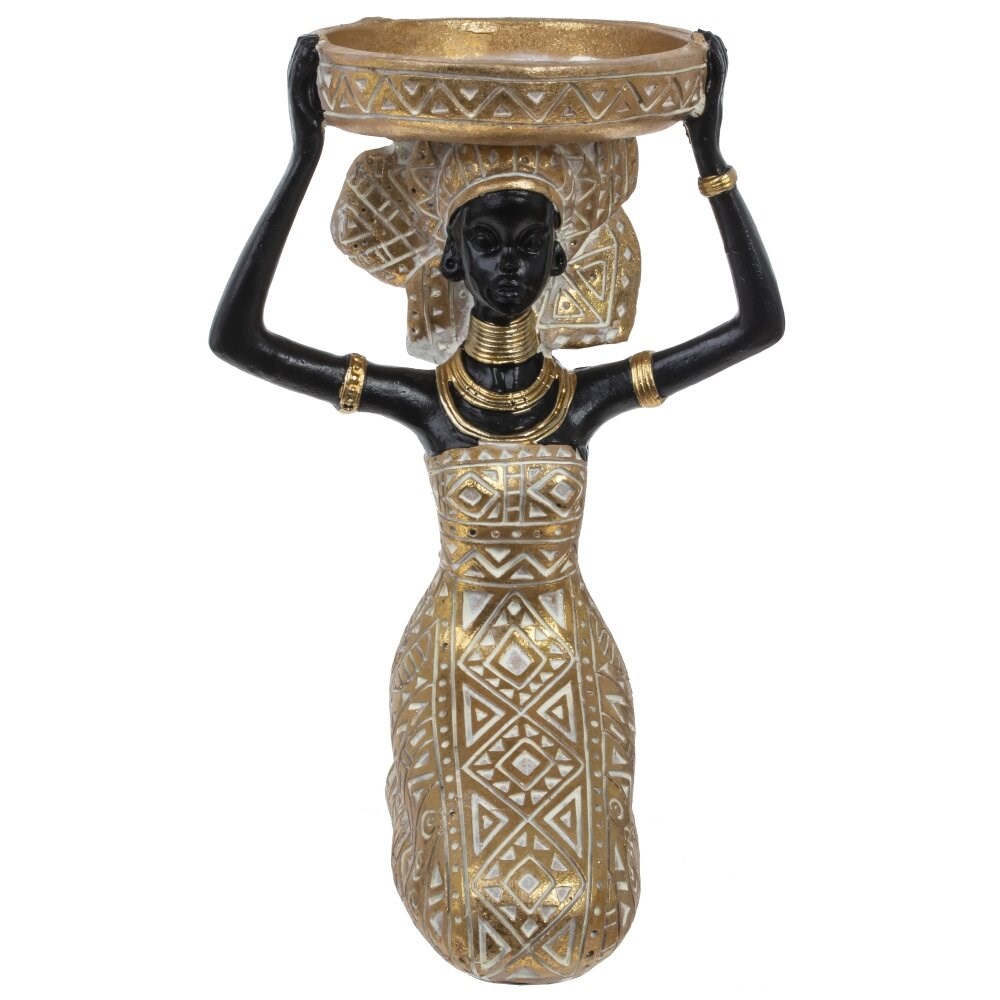 Интересный подсвечник в виде фигурки африканки экзотической одежде с тарелкой на голове. Изделие выполнено в черном и золотом цветах. Эффектный сувенир освежит самую скучную комнату, добавит ей шарма и загадочности.