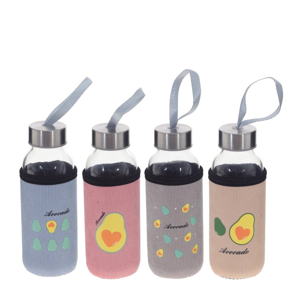 Бутылка для воды изготовлена из прозрачного стекла. Оснащена завинчивающейся крышкой с ремешком для переноски и чехлом для защиты при случайных падениях. Объем: 300 мл. Представлено в четырех вариантах.