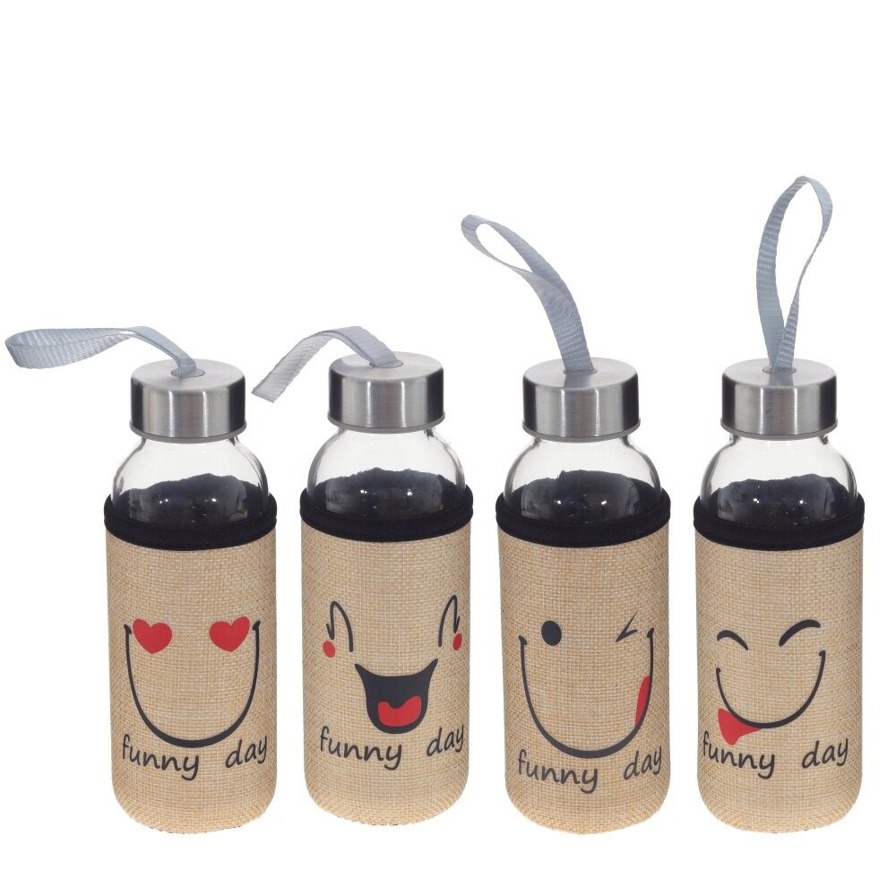 Бутылка для воды изготовлена из прозрачного стекла. Оснащена завинчивающейся крышкой с ремешком для переноски и чехлом для защиты при случайных падениях. Объем: 300 мл. Представлено в четырех вариантах.