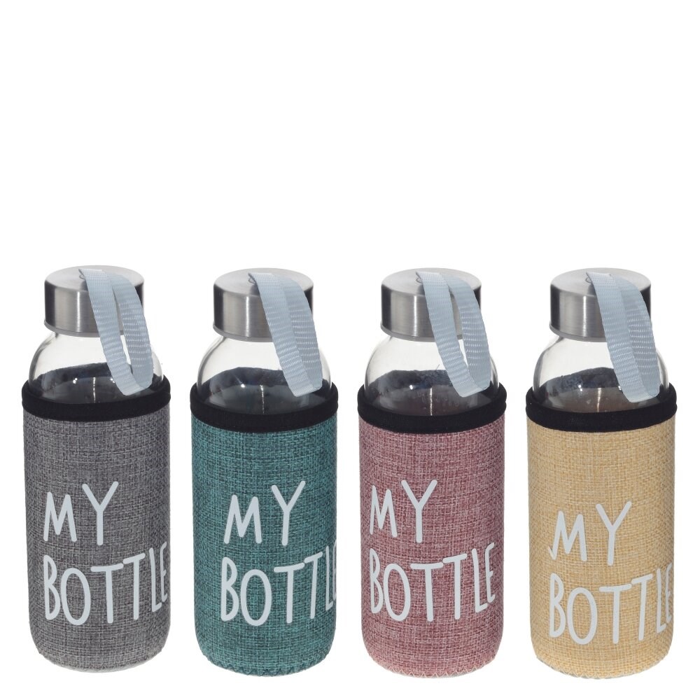 Бутылка для воды изготовлена из прозрачного стекла. Оснащена завинчивающейся крышкой с ремешком для переноски и чехлом для защиты при случайных падениях. Объем: 350 мл. Представлена в четырех вариантах.