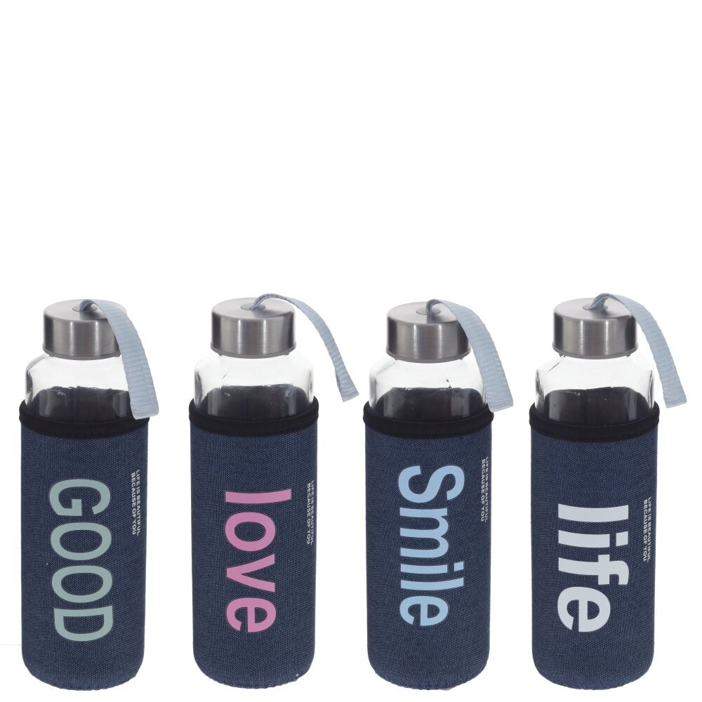 Бутылка для воды изготовлена из прозрачного стекла. Оснащена завинчивающейся крышкой с ремешком для переноски и чехлом для защиты при случайных падениях. Объем: 400 мл. Представлена в четырех вариантах.
