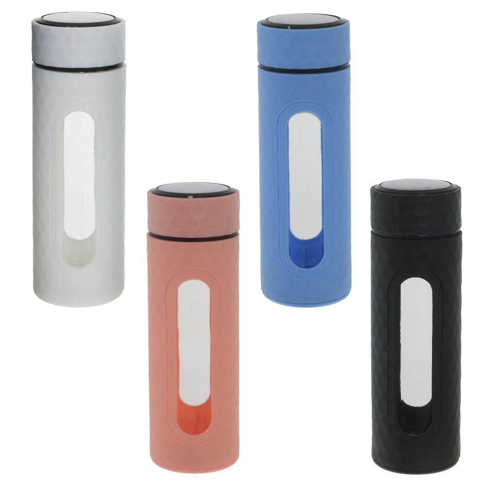 Стеклянная бутылка объемом 450 мл. в пластиковом корпусе достаточно удобная и полезная вещь, отличный аксессуар для активного отдыха и прогулок. Представлена в 4 вариантах