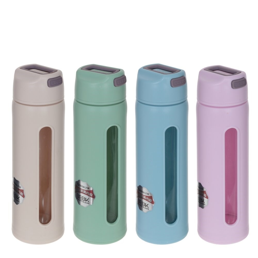 Стеклянная бутылка объемом 450 мл. достаточно удобная и полезная вещь, отличный аксессуар для активного отдыха и прогулок. Завинчивающаяся крышка пластиковая оснащена ремешком. Представлена в 4 вариантах