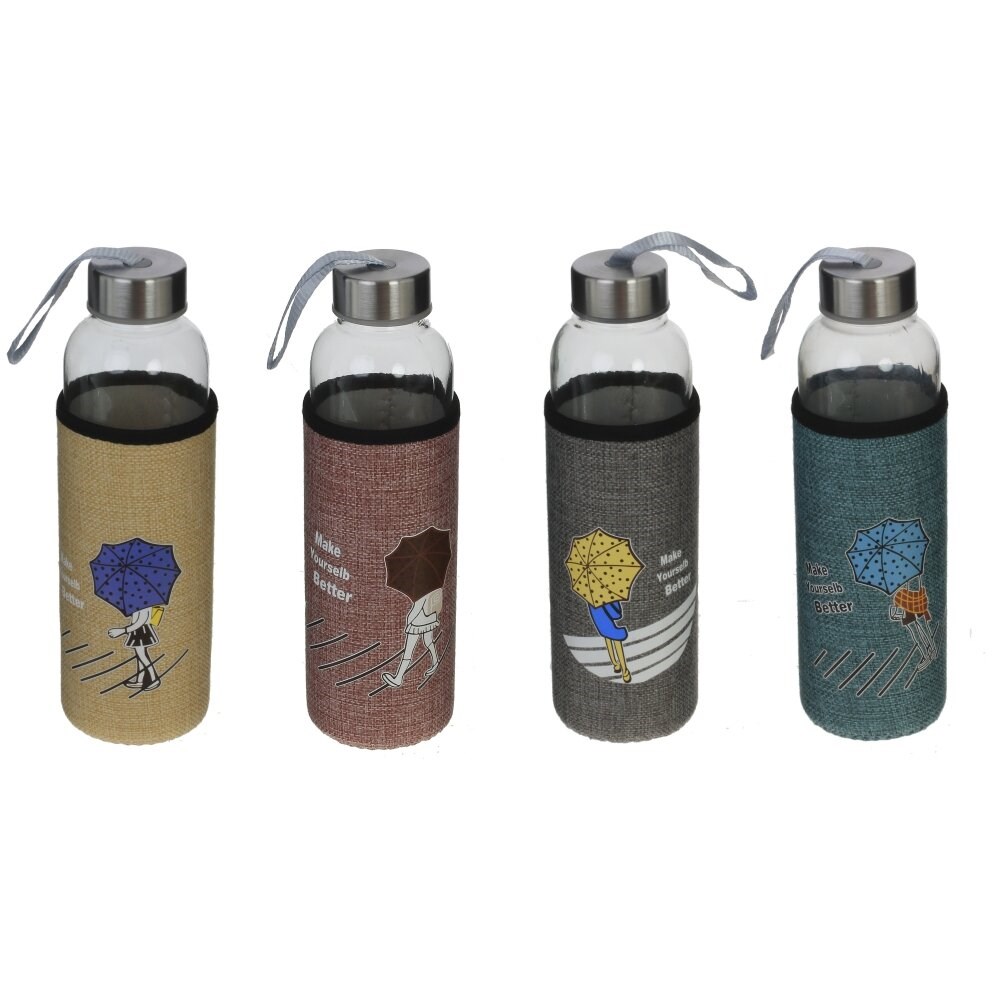 Стеклянная бутылка объемом 500 мл. достаточно удобная и полезная вещь, отличный аксессуар для спорта, активного отдыха и прогулок. Оснащена крышкой с ремешком для удобного перемещения и чехлом для защиты при случайных падениях. Представлена в 4 вариантах