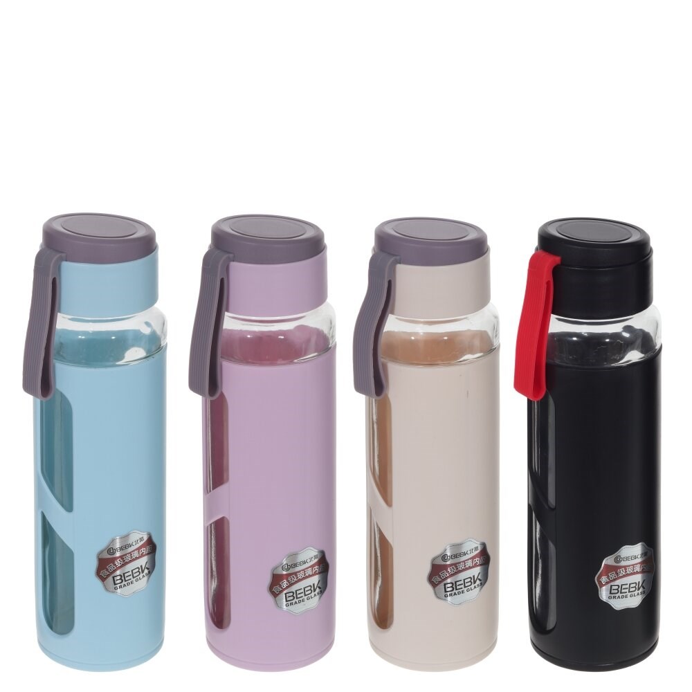 Стеклянная бутылка объемом 500 мл. достаточно удобная и полезная вещь, отличный аксессуар для активного отдыха и прогулок. Завинчивающаяся крышка пластиковая оснащена ремешком. Представлена в 4 вариантах