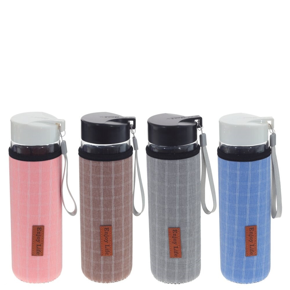Бутылка для воды изготовлена из прозрачного стекла. Оснащена завинчивающейся крышкой с ремешком для переноски и чехлом для защиты при случайных падениях. Объем: 400 мл. Представлено в четырех вариантах.